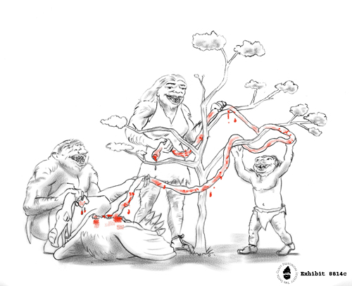 An early Paleolithic family celebrating the bounty with a beheaded nutrient rich fowl. The family is adorning it's innards around a small tree. These are the first signs of garland (holiday decor). |